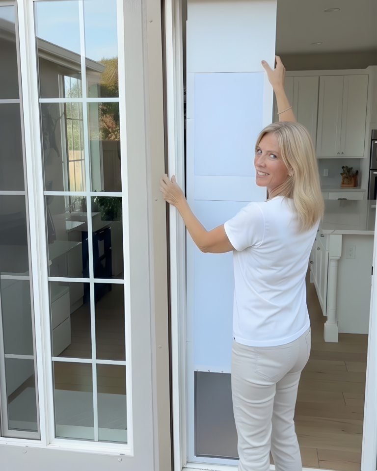 Avi's Pet Door- a stacking & interlocking piece, portable cat & doggy door made for sliding glass doors.