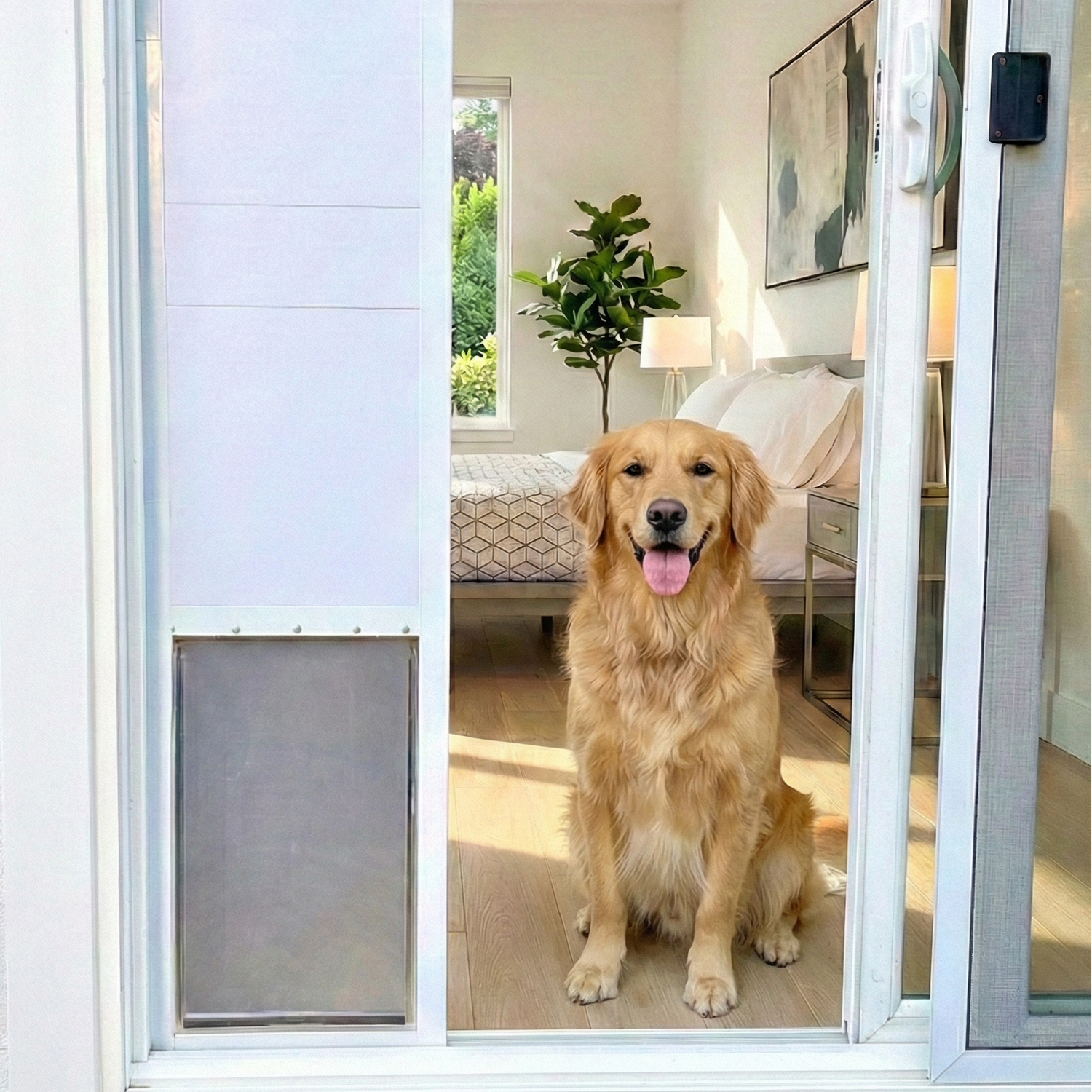 Avi’s Pet Door is a portable, stacking-piece pet door that pops into your sliding glass door in minutes to use at home or on the go. No tools. No damage. Lightweight and easy to pack up with you anywhere.